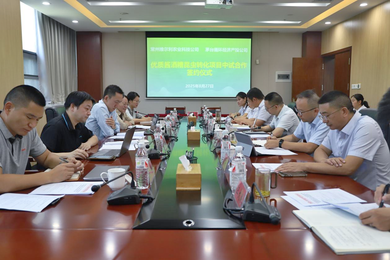 8月27日上午,維爾利集團旗下常州維爾利農業科技發展有限公司(下稱“維爾利農業”)與貴州茅臺酒廠 (集團) 循環經濟產業投資開發有限公司(下稱“茅臺循環產投公司”)正式簽署中試合作協議。雙方將攜手開展“優質醬酒糟黑水虻昆蟲轉化資源利用中試驗證研究” 項目,打造“醬酒糟——昆蟲蛋白——寵糧”產業鏈,共同探索釀酒副產物資源化利用的創新路徑。