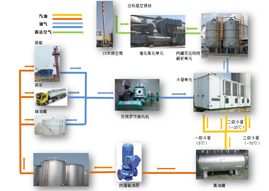 產(chǎn)品罐區(qū)及碼頭裝船區(qū),油氣經(jīng)過“收集-輸送-冷凝(吸收)-催化氧化”等工藝處理,最終達標排放。